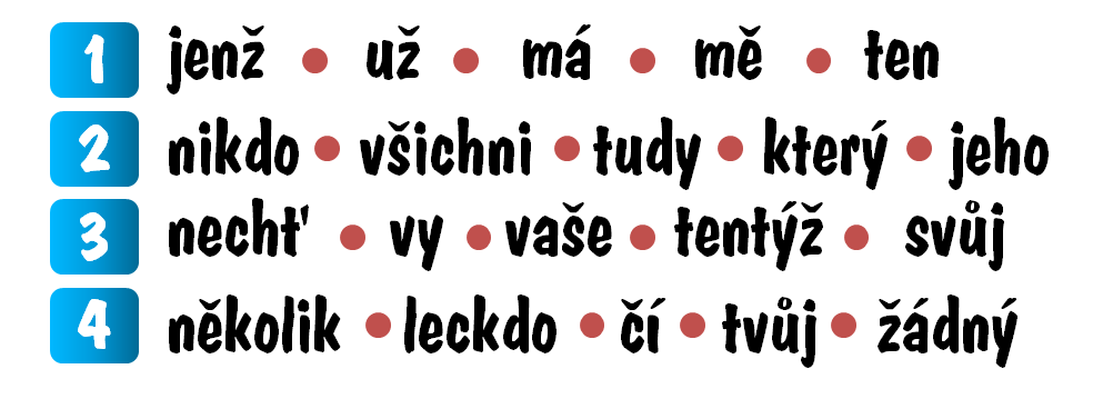 2. Doplňte vhodná písmena do "vycpávky", aby vám vznikla nová podstatná jména v 1. pádu, a vytvořte větu, která bude odpovídat následující kombinaci slovních druhů.